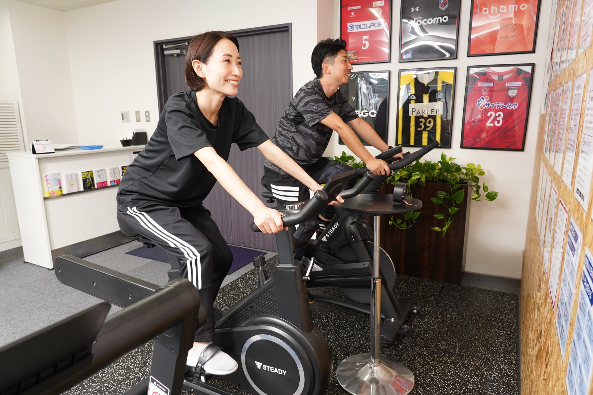 フィットネスバイクを3分ほど漕いで、体を温めます。